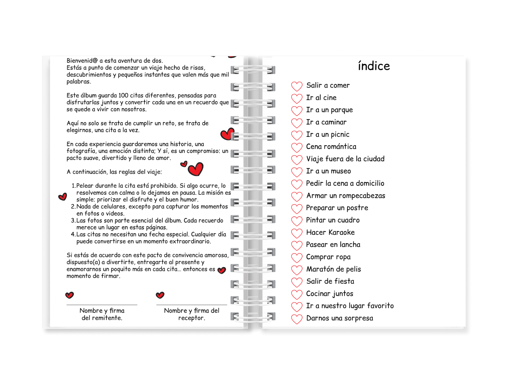 Índice con corazones para marcar citas completadas, ideal para ver el progreso y revivir recuerdos.